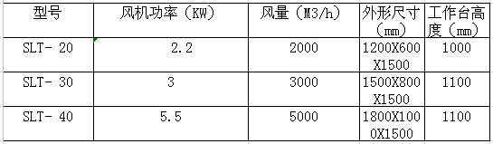 SLT系列集塵工作臺 該工作臺可以從源頭上捕集生產(chǎn)過程中產(chǎn)生的打磨粉塵,焊接以及等離子切割的煙霧。集塵工作臺配有粉塵過濾裝置、電氣控制系統(tǒng)并可選配動力裝置,可使工件進行水平或垂直方向的回轉(zhuǎn),以提高勞動效率,并可為客戶要求提供專業(yè)的集塵工作平臺?,F(xiàn)廣泛應用于焊接、打磨和等離子切割,也可去毛刺,非金屬和金屬工件表面拋光、磨光。 SLT粉塵過濾裝置自帶式工作臺的特點是放置隨意,維修方便,生產(chǎn)工藝可進行柔性編排。 SLT工作臺粉塵通過風機產(chǎn)生的負壓經(jīng)正面排風口和下排風口進入凈化器,氣流進入導流通道,大顆粒粉塵與導流板碰撞后,大顆粒粉塵在重力的作用下落入集灰抽屜,含細小顆粒的粉塵進入過濾室,含塵氣體由濾袋外表面穿過濾芯,粉塵則被濾芯阻攔在其表面,當被阻攔的粉塵在濾芯表面不斷沉積時,通過手動清灰機結構清掃濾芯,也可通過脈沖噴吹對濾筒清灰使得沉積在濾芯上的粉塵顆粒在振動的作用下脫離濾芯表面落入集灰抽屜中,使得整個濾芯表面都得到清掃,凈化后的潔凈空氣由風道、經(jīng)風機排出。獨特的臺式設計,并配有工作燈、打磨機電源插孔、夾具安裝孔,兩側板可隨時打開,方便較大工件使用。